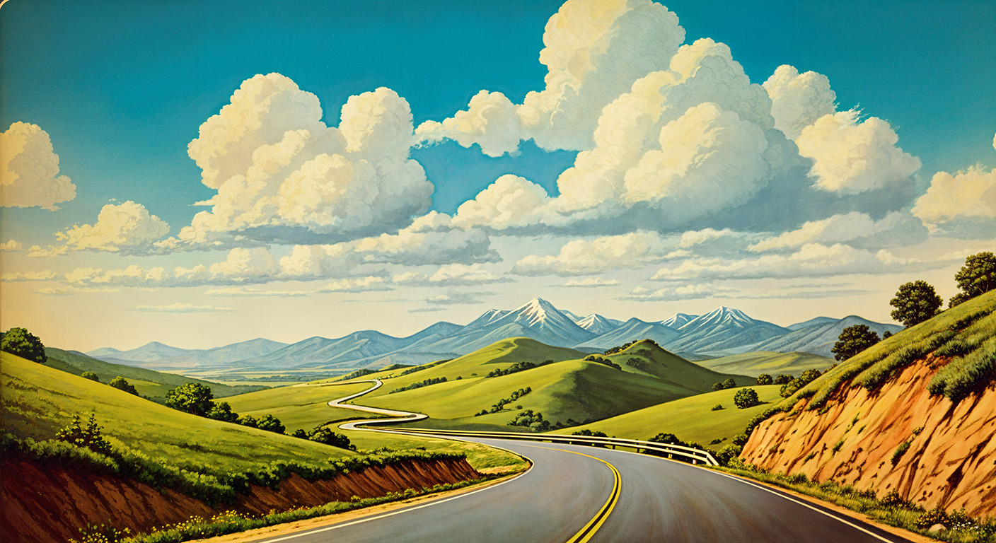 Examples of social media posts show the brand look and feel. At On the Road, they like to say that music is a journey. We translated that metaphor into pictures of a road going through different landscapes. I created AI illustrations with a warm, vintage travel poster style. Along with a library of holiday, desert, woods, snow, city, coasts, houses, and other images, the brand’s style guide has text prompts for creating more as needed.