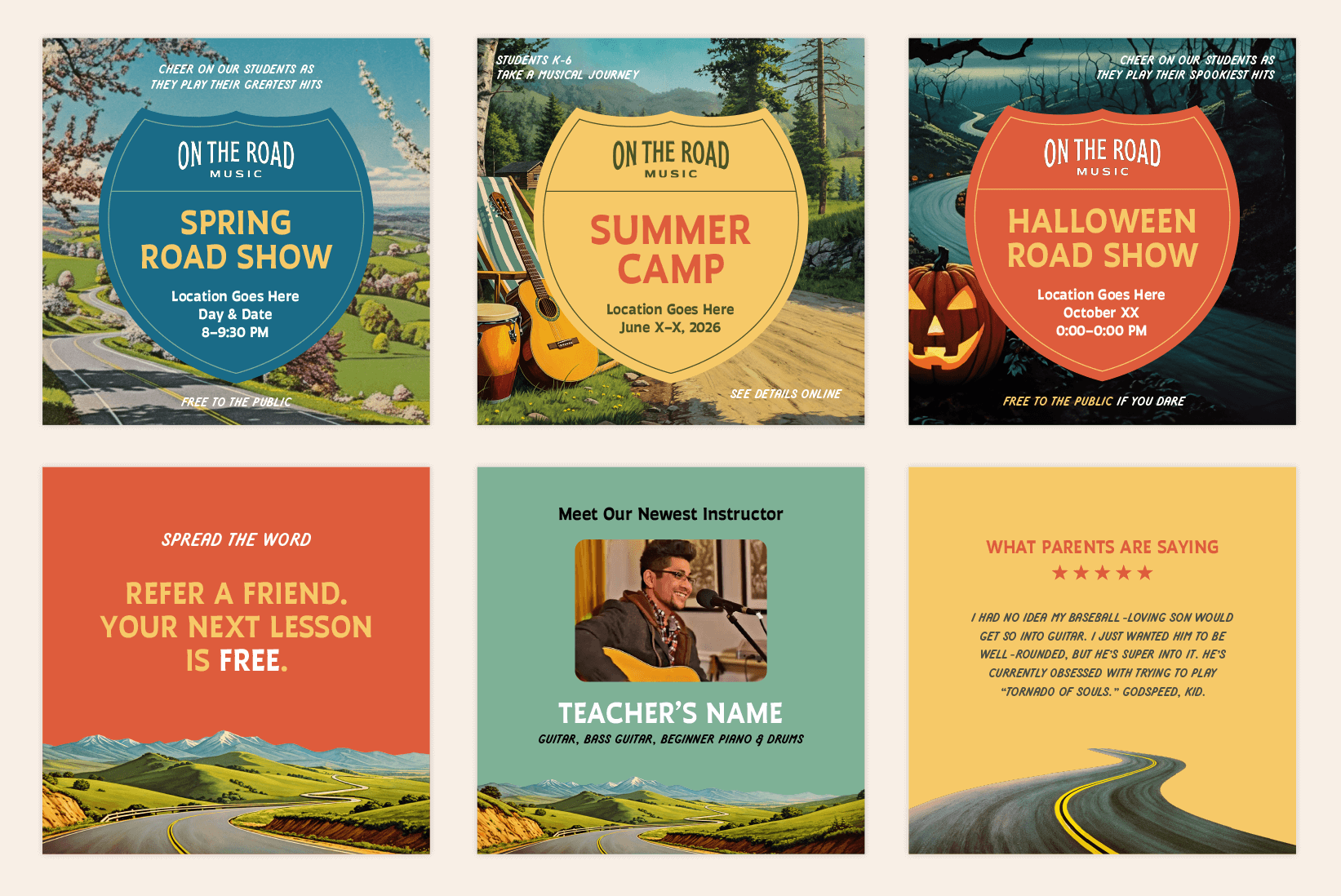 On the Road Music provides music lessons in Alpharetta, GA and the Atlanta area. Along with in-home lessons, Road Crew instructors offer group classes, summer camps, and Road Shows where students can perform and play with others. The vibe is relaxed and casual, and they believe learning music should be a cool adventure. In branding this music school, we wanted to capture that spirit of fun and exploration. We took inspiration from American road trips and national parks.